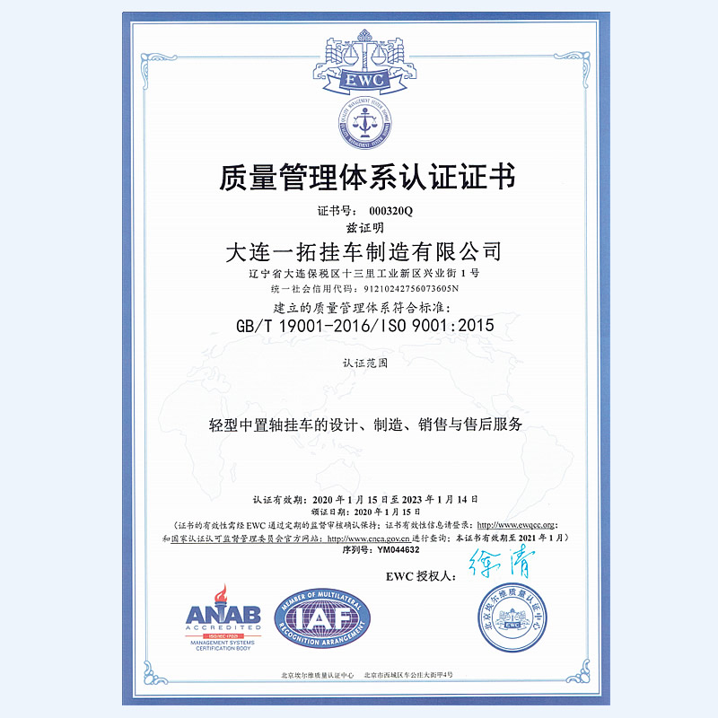 大連一拓掛車制造有限公司,地處遼寧省大連保稅區十三里工業新區興業街1號,公司占地45000m㎡,總建筑面積24000㎡,現有生產、檢測、研發設備100余臺套,擁有自動化程度很高的機器人焊接生產線。大連一拓掛車制造有限公司成立于2013年,是一家具備國家工信部專用車生產資質企業,致力于乘用車掛車的設計和生產,主要產品有:平板板式輕型中置軸掛車、欄板式輕型中置軸掛車、廂式輕型中置軸掛車、特種結構式輕型中置軸掛車,并承接各種用途輕型中置軸掛車設計等業務。公司秉承“銳意進取,開拓創新,精益求精,誠信共贏”的運營理念,竭誠為您服務。
